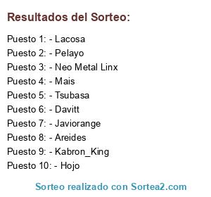 Lista de participantes: - Areides, - Pelayo, - Davitt, - Neo Metal Linx, - Kabron_King, - Lacosa, - Tsubasa, - Mais, - Hojo, - Javiorange.