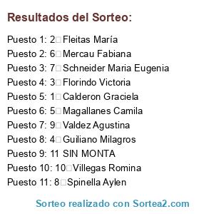 Lista de participantes: 1 Calderon Graciela, 2 Fleitas María, 3 Florindo Victoria, 4 Guiliano Milagros, 5 Magallanes Camila, 6 Mercau Fabiana, 7 Schneider Maria Eugenia, 8 Spinella Aylen, 9 Valdez Agustina, 10 Villegas Romina, 11 SIN MONTA.