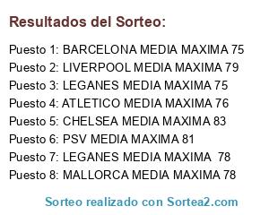 Lista de participantes: LIVERPOOL MEDIA MAXIMA 79, MALLORCA MEDIA MAXIMA 78, CHELSEA MEDIA MAXIMA 83, LEGANES MEDIA MAXIMA 78, LEGANES MEDIA MAXIMA 75, BARCELONA MEDIA MAXIMA 75, PSV MEDIA MAXIMA 81, ATLETICO MEDIA MAXIMA 76.