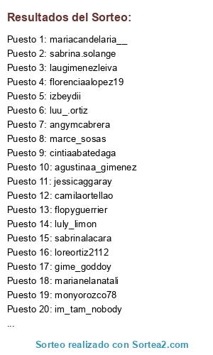 Lista de participantes: cintiaabatedaga, deborahferramola, luu_.ortiz (2), monyorozco78, sabrinalacara, laugimenezleiva, camilaortellao, marianelanatali, florenciaalopez19, loreortiz2112, agustinaa_gimenez, angymcabrera, gime_goddoy, jessicaggaray, mariacandelaria__, im_tam_nobody, luly_limon, izbeydii, flopyguerrier, sabrina.solange, marce_sosas, tobaresmicaela.