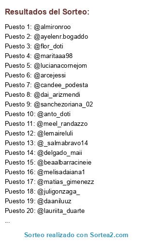Lista de participantes: @maritaaa98(189), @daaniluuz(16), @lucianacornejom(11), @_salmabravo14(11), @beaalbarracineie(11), @lucianatell0__(15), @flor_doti(19), @sanchezoriana_02(21), @juligonzaga_(11), @matias_gimenezz(11), @dai_arizmendi(21), @meel_randazzo(11), @melisadaiana1(13), @lemaireluli(11), @arcejessi(11), @lauriita_duarte(13), @mariela_mayorgaa(1), @rosinoemii(11), @almironroo(27), @sabrina.ponce.737(3), @zeelmii(11), @anto_doti(4), @ayelenr.bogaddo(20), @priscilajaeel(1), @candee_podesta(25), @agus_suarezzzzz(1), @delgado_maii(3).