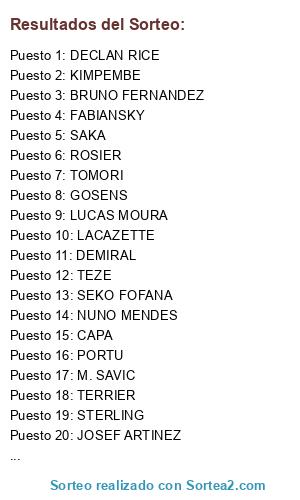 Lista de participantes: FABIANSKY, ADAN, NUNO MENDES, GOSENS, KIMPEMBE, TOMORI, DEMIRAL, TEZE, CAPA, ROSIER, DECLAN RICE, SEKO FOFANA, BRUNO FERNANDEZ, M. SAVIC, LUCAS MOURA, PORTU, SAKA, STERLING, TERRIER, JOSEF ARTINEZ, D. ZAPATA, LACAZETTE.