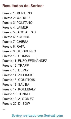 Lista de participantes: COURTOIS, TRAPP, WALKER, KOULIBALY, KOUNDE, SALIBA, DI LORENZO, MENDY, LAIMER, TONALI, ZIELINSKI, A. GÓMEZ, D. SOW, CHIESA, ENZO FERNÁNDEZ, COMAN, MERTENS, RICARDO HORTA, RAFA, IAGO ASPAS, POLITANO, DEPAY.