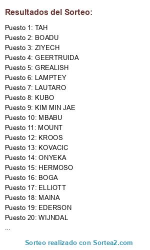 Lista de participantes: EDERSON, MUSSO, KIM MIN JAE, HERMOSO, WIJNDAL, GEERTRUIDA, TAH, MBABU, LAMPTEY, MOUNT, KUBO, ONYEKA, MAINA, KROOS, KOVACIC, ELLIOTT, BOGA, MOUKOKO, ZIYECH, GREALISH, LAUTARO, BOADU.