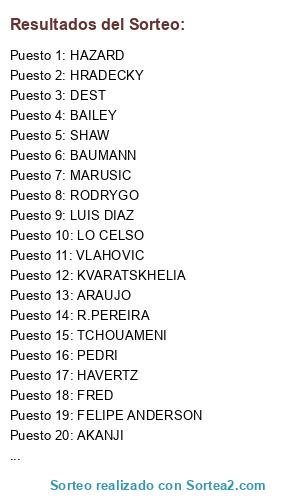 Lista de participantes: BAUMANN, HRADECKY, ARAUJO, AKANJI, DEST, R.PEREIRA, MARUSIC, SHAW, PEDRI, FRED, TCHOUAMENI, SABITZER, LO CELSO, HAVERTZ, HAZARD, LUIS DIAZ, RODRYGO, VLAHOVIC, FELIPE ANDERSON, KVARATSKHELIA, BAILEY.
