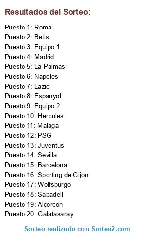 Lista de participantes: Alcorcon, Roma, Sabadell, Barcelona, Galatasaray, Hercules, Juventus, Malaga, Lazio, Betis, Espanyol, Madrid, Sevilla, Napoles, Sporting de Gijon, PSG, Wolfsburgo, La Palmas, Equipo 1, Equipo 2.