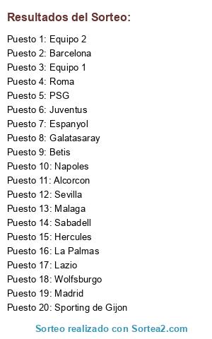 Lista de participantes: Alcorcon, Roma, Sabadell, Barcelona, Galatasaray, Hercules, Juventus, Malaga, Lazio, Betis, Espanyol, Madrid, Sevilla, Napoles, Sporting de Gijon, PSG, Wolfsburgo, La Palmas, Equipo 1, Equipo 2.