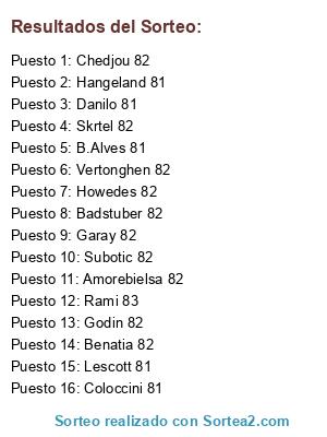 Lista de participantes: Rami 83, Garay 82, Vertonghen 82, Subotic 82, Badstuber 82, Benatia 82, Howedes 82, Amorebielsa 82, Skrtel 82, Chedjou 82, Godin 82, Danilo 81, Hangeland 81, Coloccini 81, Lescott 81, B.Alves 81.