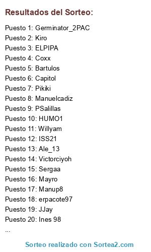 Lista de participantes: Valnir, ISS21, Gbiturbo, Germinator_2PAC, Willyam, Jorgico 94, Ines 98, Pikiki, Victorciyoh, Kiro, Mayro, Teide86, Capitol, Sizko83, JJay, Coxx, Bartulos, Manup8, Manuelcadiz, Txoman, Ale_13, ki0h_11, Sergy, PSalillas, Sergaa, erpacote97, Jomalk, ELPIPA, Sawyer_FCB, HUMO1.