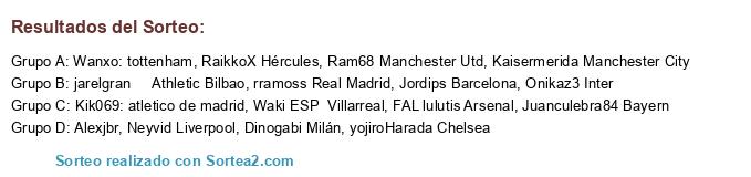 Lista de participantes: Ram68 Manchester Utd, Jordips Barcelona, Kaisermerida Manchester City, Neyvid Liverpool, yojiroHarada Chelsea, rramoss Real Madrid, RaikkoX Hércules, Dinogabi Milán, Onikaz3 Inter, Juanculebra84 Bayern, Waki ESP Villarreal, FAL lulutis Arsenal, Kik069: atletico de madrid, Wanxo: tottenham, jarelgran Athletic Bilbao, Alexjbr.