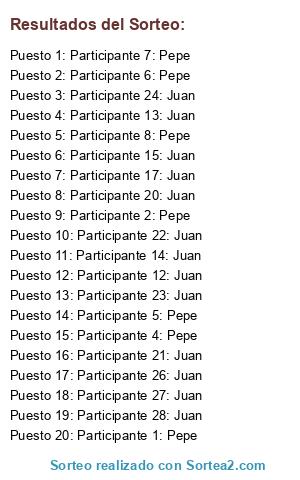 Lista de participantes: Participante 1: Pepe, Participante 2: Pepe, Participante 3: Pepe, Participante 4: Pepe, Participante 5: Pepe, Participante 6: Pepe, Participante 7: Pepe, Participante 8: Pepe, Participante 9: Pepe, Participante 10: Pepe, Participante 11: Juan, Participante 12: Juan, Participante 13: Juan, Participante 14: Juan, Participante 15: Juan, Participante 16: Juan, Participante 17: Juan, Participante 18: Juan, Participante 19: Juan, Participante 20: Juan, Participante 21: Juan, Participante 22: Juan, Participante 23: Juan, Participante 24: Juan, Participante 25: Juan, Participante 26: Juan, Participante 27: Juan, Participante 28: Juan, Participante 29: Juan, Participante 30: Juan.
