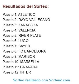 Lista de participantes: GRANADA, RAYO VALLECANO, INTER, MARIBOR, ATLETICO, VALENCIA, FC BARCELONA, MARSELLA, RIVER PLATE, LUGO, BAYER, ZARAGOZA.