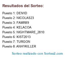 Lista de participantes: DEIVID, TURGON, ANHYKILLER, NICOLAS23, FAMR89, KIST2013, KELACOA, NIGHTMARE_2810.