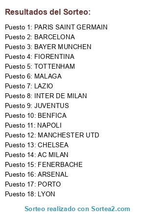 Lista de participantes: AC MILAN, ARSENAL, BARCELONA, BAYER MUNCHEN, BENFICA, CHELSEA, FENERBACHE, FIORENTINA, INTER DE MILAN, JUVENTUS, LAZIO, LYON, MALAGA, MANCHESTER UTD, NAPOLI, PARIS SAINT GERMAIN, PORTO, TOTTENHAM, .