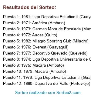 Lista de participantes: 1971: América (Ambato), 1972: Aucas (Quito), 1973: Carmen Mora de Encalada (Machala), 1974: Liga Deportiva Universitaria de Quito (Quito), 1975: Macará (Ambato), 1976: Everest (Guayaquil), 1977: Deportivo Quevedo (Quevedo), 1978: Liga Deportiva Estudiantil (Guayaquil), 1979: Macará (Ambato), 1980: Deportivo del Valle (Portoviejo), 1981: Liga Deportiva Estudiantil (Guayaquil), 1982: Milagro Sporting Club (Milagro).
