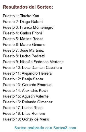 Lista de participantes: Gerardo Emanuel, Carlos Frioni, Luca Damian Caballero, Matias Rodas, Franco Montenegro, Nicolás Federico Mertens, Lucho Pedretti, Tincho Kun, Agustin Valente, Rolando Gimenez, Benja Santa, Elias Romero, Lucho Rhcp, José Martinez, Diego Gabriel, Mauro Gimeno, Alejandro Herrera, Alex Elric Koch, Gonzy de Merlo.