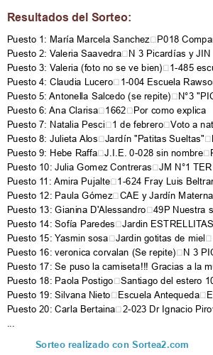 - Cocina electrica (o voucher por $7.500) Rio Shop : Romina Lucero Jardin Gotitas de miel N6. J137. SEOS Porque es una bella Docente y muy Amorosa con sus alumnos. Responsable en su tarea y comprometida.