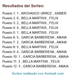 Lista de participantes: 1 , ARCHANCO URROZ , XABIER, 1 , BELLA MARTINS , FELIX, 1 , GARCIA BARBERENA , AMAIA, 2 , BELLA MARTINS , FELIX, 2 , GARCIA BARBERENA , AMAIA, 3 , BELLA MARTINS , FELIX, 3 , GARCIA BARBERENA , AMAIA, 4 , BELLA MARTINS , FELIX, 4 , GARCIA BARBERENA , AMAIA, 5 , BELLA MARTINS , FELIX, 5 , GARCIA BARBERENA , AMAIA, 6 , BELLA MARTINS , FELIX.