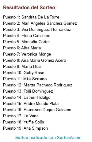 Lista de participantes: Noelia Rodriguez Campos, Ana Belen MoonShine, Laura Martin, Jennifer Moreno Iglesias, Virginia Rubio, Martta Pacheco Rodriguez, Jenni Bravo Mejías, Mamen GC, Tati Andres Carlos, Khrystyna Cristina Mykulyak, Lara Galan, Veronica Monge, San González, Chelo Gutiérrez Alvarado, Sara NevOrt, Maria Maestre, Victoria Trenado Rubio, Julia Cabeza, Nieves Jimenez Ortega, Raquel León Valor, Maria Sonia B M, Elena Vernan, Elena Molina Manzano, Raquel Lancho Pedrazo, Sory Skunk, Lorena Prieto Carrasco, Rosa Maria Goye Ruiz, Mimi Leon Cruz, Miriam CuBla, May Pa Ro, Rocio Garcia Rebollo, Virginia Ariza Fernandez, Elisa Fernández Ariza, Carmen Santos Gonzalez, Maria Gonzalez, Julia Casares, Vicky Perez, Guille Téllez, África Martín Tato, Celia Gonzalez Muñoz, Kiomara Ro, Cristina Corchado, Montaña Saro Puerto, Maria Moreno, Elena Caballero, Monica Peralo, Ana Isabel Perez Gomez, José Antonio Same, Laura Barriga, Sonia Figueredo Fernández, Chelo Habela Hernandez, Teresa Lopez, Maria Duran Roman, Richi Cab Lóp, Ana Belen Rubio Isidro, Alba Maria, Leonetta NoFarina, Veronica Priego Crespo, Natalia Sanchez Diaz, María Díaz, Candy González, Violeta Fdez-espina, Alejandra Zabala, Gaby Rose, Anita Corchado, Bea Aeb, Cristina Cámara Quintanilla, Montaña Gomez, Mónica Del Amo López, Inma De Dios Escobero, María Forero Méndez, Ana Maria Gomez Acero, Delia Diaz Dominguez, Toñi Dominguez, Esther Hidalgo, María Duarte León, Maru Solis, Almudena Marquez Isidro, Aina Gabaza, Mila Serrano, Macarena Aber, Eva Piñas, Ana Rodriguez Romero, Sandra Vaquero, Alfonso Fernández, Victor Marcos, Nuria Muriel Rubio, Raquel Garcia Garcia, Maite Matías Estévez, Sandra Gonm, Montaña Cortes, Anna Kannal, Francisco Duque Galeano, Rocío Iglesias, Marifeli Luengo Camacho, Catalina Gonzalez, Paola Málaga Remis, Inma Pérez Gómez, Carolina González, Sandra Navas Ruanes, Maria Garcia Doncel, Maria Angeles Cisneros, PenélopeGlamour PV, Sandrita De La Torre, Eva BSanchez, Ana Simpson, Gala Maria Carmen Garcia Jimenez, Iga Swierkowska, Minerva Acedo Castañares, La Vane, Eli Muelas, Angie Rey, Marivï Ch G Ch, Nieves Portal, Javi Barroso, Angel Sanchez, Yolanda Neila, Laura Corrales, Patri Aliva Zehcnas, Pedro Mendo Plata, Rosa Barquilla García, Almu Solis, Laura Vega Ramírez, Maria Barrantes Brillo, Celia Ruiz Galea, Olguiss Podo, Visi Domínguez Hernández, Maria Jose Fernandez, Juan Carlos Redondo Ojalvo, Almudena Galapero, Coral Lopez Hidalgo, Vicky Campa Cantero, Rebeca Mendoza Ferrer, Paco De Borja, Elo Duran, Arancha Lancho Manzano, Jorge Ramos Ávalo, Ines Maria Gomez Medina, Valeria Gonzalez, Beita Wapita, Elisa Nuñez Garcia, Mari Ángeles Sánchez Gómez, Santiago Valle Moreno, Inmaculada Arjona Izquierdo, Yuffie Solís, Maria Solis Fernandez, .