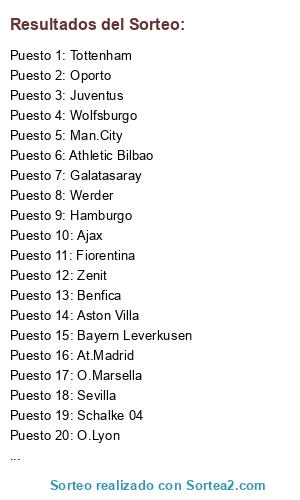 Lista de participantes: Athletic Bilbao, Inter Milan, Schalke 04, Juventus, Valencia, Zenit, Everton, Werder, Oporto, Rubin Kazan, Man.United, Liverpool, Stuttgart, Roma, Wolfsburgo, Galatasaray, Man.City, Hamburgo, Benfica, At.Madrid, Fiorentina, Real Madrid, Sevilla, Ajax, Bayern Munich, O.Lyon, Tottenham, Aston Villa, Villarreal, O.Marsella, Bayern Leverkusen, Lazio.