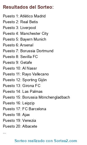 Lista de participantes: Sporting Gijón, Racing Club, Bayern Munich, Las Palmas, RCD Mallorca, Chelsea, Rayo Vallecano, Borussia Mönchengladbach, Girona FC, Atlético Madrid, Manchester United, Albacete, Getafe, Liverpool, Alavés, Manchester City, FC Barcelona, Real Madrid, Athletic Bilbao, Al Nassr, Venezia, Ajax, Real Betis, Arsenal, Real Zaragoza, Sevilla FC, Borussia Dortmund, Leipzip, FC Augsburg, Roma.
