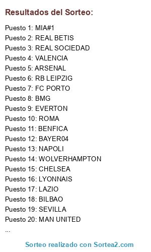 Lista de participantes: BENFICA, VILLARREAL, MAN UNITED, LEICESTER, ARSENAL, BMG, VALENCIA, EVERTON, AJAX, ATALANTA, LYONNAIS, CHELSEA, BAYER04, ROMA, RB LEIPZIG, MIA#1, BILBAO, REAL BETIS, FC PORTO, NAPOLI, REAL SOCIEDAD, SEVILLA, LAZIO, WOLVERHAMPTON.