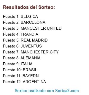 Lista de participantes: REAL MADRID, BARCELONA, JUVENTUS, BAYERN, MANCHESTER CITY, MANCESTER UNITED, ARGENTINA, ALEMANIA, BRASIL, ITALIA, BELGICA, FRANCIA.