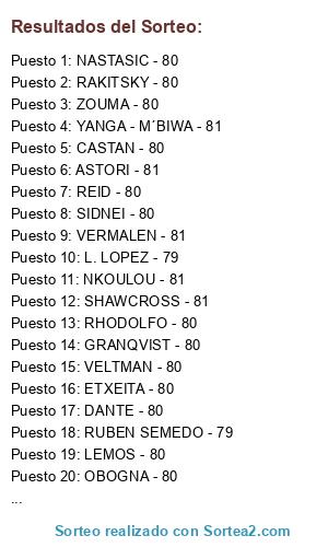 Lista de participantes: CARRIÇ0 - 81, NKOULOU - 81, YANGA - M´BIWA - 81, ASTORI - 81, SHAWCROSS - 81, VERMALEN - 81, MATHIEU - 81, LEMOS - 80, VELTMAN - 80, NASTASIC - 80, ZOUMA - 80, MURILLO - 80, ABDENNOUR - 80, RAKITSKY - 80, J. BRUMA - 80, MANGALA - 80, ETXEITA - 80, T. KOLODZIEJCZAK - 80, OBOGNA - 80, CHEDJOU - 80, SIDNEI - 80, RHODOLFO - 80, TASCI - 80, REID - 80, H. MORENO - 80, CASTAN - 80, G. CABRAL - 80, DANTE - 80, GRANQVIST - 80, HUTH - 80, RUBEN SEMEDO - 79, L. LOPEZ - 79.