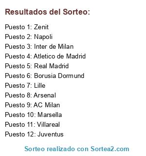 Lista de participantes: Inter de Milan, Lille, Arsenal, Real Madrid, Villareal, Juventus, Atletico de Madrid, Napoli, Zenit, Marsella, Borusia Dormund, AC Milan.