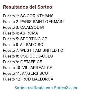 Lista de participantes: GETAFE CF, CSD COLO-COLO, SC CORINTHIANS, VILLARREAL CF, RCD MALLORCA, ANGERS SCO, SPORTING CP, AS ROMA, AL SADD SC, WEST HAM UNITED FC, PARIS SAINT GERMAIN, CA ALSODIVI.