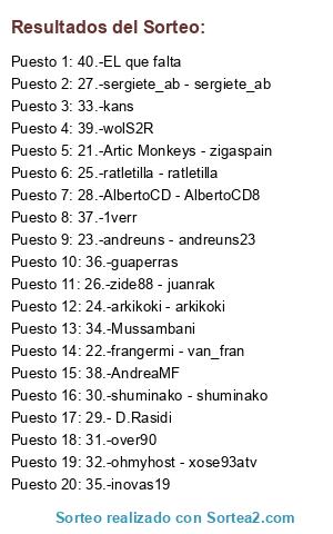 Lista de participantes: 21.-Artic Monkeys - zigaspain, 22.-frangermi - van_fran, 23.-andreuns - andreuns23, 24.-arkikoki - arkikoki, 25.-ratletilla - ratletilla, 26.-zide88 - juanrak, 27.-sergiete_ab - sergiete_ab, 28.-AlbertoCD - AlbertoCD8, 29.- D.Rasidi, 30.-shuminako - shuminako, 31.-over90, 32.-ohmyhost - xose93atv, 33.-kans, 34.-Mussambani, 35.-inovas19, 36.-guaperras, 37.-1verr, 38.-AndreaMF, 39.-wolS2R, 40.-EL que falta.