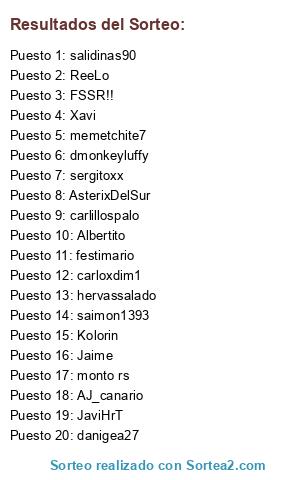 Lista de participantes: Albertito, Kolorin, monto rs, JaviHrT, hervassalado, danigea27, Jaime, saimon1393, FSSR!!, carloxdim1, sergitoxx, dmonkeyluffy, festimario, AJ_canario, Xavi, ReeLo, AsterixDelSur, salidinas90, carlillospalo, memetchite7.
