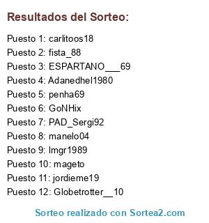 Lista de participantes: Adanedhel1980, carlitoos18, ESPARTANO___69, fista_88, Globetrotter__10, GoNHix, jordieme19, lmgr1989, mageto, manelo04, PAD_Sergi92, penha69.