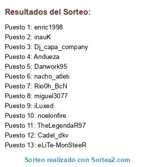 Lista de participantes: nacho_atleti, Danwork95, TheLegendaR97, inauK, Cadel_dkv, enric1998, Dj_capa_company, Andueza, noelonfire, Rio0h_BcN, eLiTe-MonSteeR, iLuxed, miguel3077.