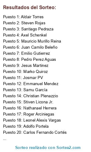 Lista de participantes: Adolfo Portela, Aldair Torres, Axel Schenkel, Carlos Fernando Cortés, Carlos Mirmidones, Christian Plenazzio, Eddy López Jr., Emilio Gutierrez, Emmanuel Mendez, Gerson Ramirez, Jesus Martinez, Jonathan David Vera, José Valdiviezo, Josmar PV, Juan Andres Lugo, Juan Camilo Beleño, Juan Silva, Leonel Alexis Vargas, Marko Quiroz, Mauricio Murillo Reina, Nathanael Herrera, Pedro Perez Aguas, Reimer Rivas, Roger Arciniegas, Samu García, Santiago Pedraza, Sebastian Lopez, Steven Rojas, Stiven Licona Jr., Valenttino Casanova.