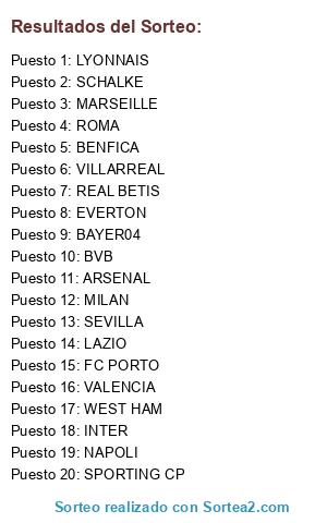 Lista de participantes: SEVILLA, SCHALKE, EVERTON, BAYER04, ARSENAL, NAPOLI, VALENCIA, MILAN, BVB, WEST HAM, FC PORTO, INTER, SPORTING CP, MARSEILLE, VILLARREAL, LAZIO, ROMA, LYONNAIS, REAL BETIS, BENFICA.