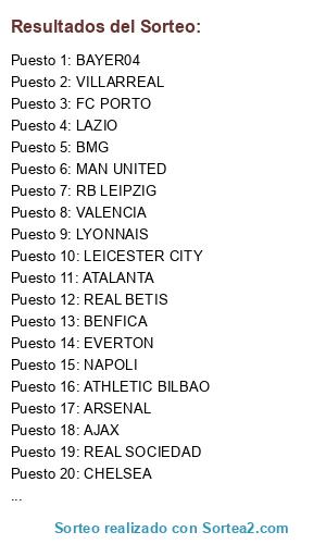 Lista de participantes: ATALANTA, REAL BETIS, REAL SOCIEDAD, NAPOLI, LAZIO, MAN UNITED, LEICESTER CITY, RB LEIPZIG, CHELSEA, LYONNAIS, ARSENAL, BMG, ATHLETIC BILBAO, VALENCIA, SEVILLA, BAYER04, BENFICA, AJAX, EVERTON, ROMA, VILLARREAL, FC PORTO.