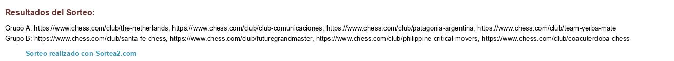 Lista de participantes: https://www.chess.com/club/coacuterdoba-chess, https://www.chess.com/club/santa-fe-chess, https://www.chess.com/club/the-netherlands, https://www.chess.com/club/philippine-critical-movers, https://www.chess.com/club/club-comunicaciones, https://www.chess.com/club/futuregrandmaster, https://www.chess.com/club/patagonia-argentina, https://www.chess.com/club/team-yerba-mate.