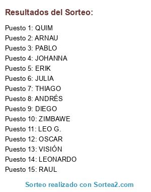 Lista de participantes: ANDRÉS, ARNAU, DIEGO, ERIK, JOHANNA, JULIA, LEONARDO, LEO G., OSCAR, PABLO, QUIM, RAUL, THIAGO, VISIÓN, ZIMBAWE.