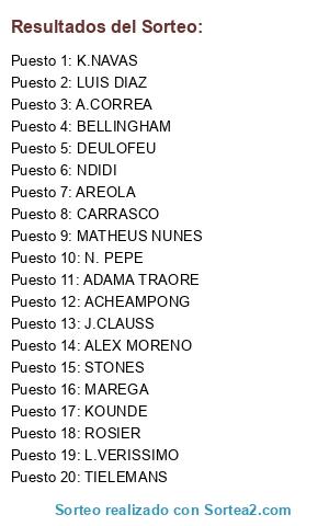 Lista de participantes: K.NAVAS, AREOLA, KOUNDE, L.VERISSIMO, ALEX MORENO, J.CLAUSS, STONES, ROSIER, BELLINGHAM, NDIDI, N. PEPE, MATHEUS NUNES, ADAMA TRAORE, TIELEMANS, MAREGA, CARRASCO, A.CORREA, ACHEAMPONG, DEULOFEU, LUIS DIAZ.
