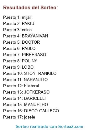 Lista de participantes: BARICELLI, STOYTRANKILO, POLINY, DOCTOR, JOTKERASO, NARANJITO, BRAYANIVAN, DIEGO GALLEGO, PIBEERASO, LOBO, PABLO, PAKIU, MANUELHO, josele, colon, bilateral, mijail.