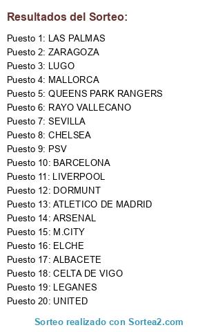 Lista de participantes: PSV, BARCELONA, RAYO VALLECANO, M.CITY, ATLETICO DE MADRID, DORMUNT, UNITED, LIVERPOOL, SEVILLA, QUEENS PARK RANGERS, LEGANES, CHELSEA, MALLORCA, ELCHE, LUGO, ALBACETE, ZARAGOZA, LAS PALMAS, CELTA DE VIGO, ARSENAL.