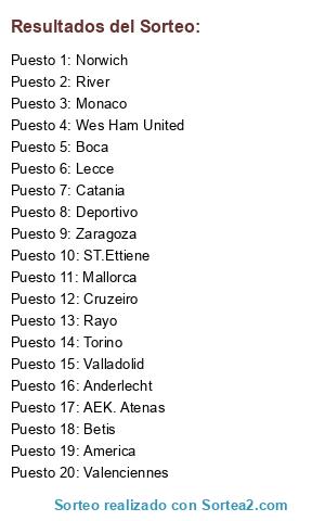 Lista de participantes: Betis, Deportivo, Mallorca, America, Valladolid, ST.Ettiene, Rayo, Catania, Lecce, Torino, Cruzeiro, Monaco, Zaragoza, Valenciennes, Wes Ham United, Norwich, Anderlecht, AEK. Atenas, Boca, River.