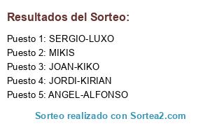 Lista de participantes: ANGEL-ALFONSO, JOAN-KIKO, JORDI-KIRIAN, MIKIS, SERGIO-LUXO.