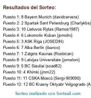 Lista de participantes: 1 Zalgiris Kaunas (Rosbican), 2 Spartak Sant Petersburg (Charlykbs), 3 ASK Riga (JOSEDIN), 4 Khimki (jmm22), 5 BC Siauliai (soad82), 6 Lokomotiv Kuban (jomolni), 7 Alba Berlín (ibanco), 8 Bayern Munich (davidcervera), 9 Latvijas Universitate (jomaloni), 10 Lietuvos Rytas (Ramos1987), 11 CSKA Moscú (Sergi-909090), 12 BC Krasny Oktyabr Volgogrado (Antuanico).