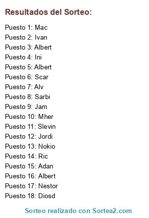 Lista de participantes: Nokio, Diosd, Sarbi, Ini, Jam, Mher, Alv, Jordi, Scar, Slevin, Nestor, Ivan, Ric, Cabe, Albert, Mac, Adan, Albert, Albert.