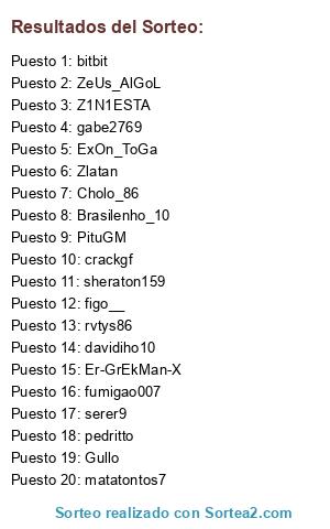 Lista de participantes: Brasilenho_10, Er-GrEkMan-X, ZeUs_AlGoL, PituGM, Z1N1ESTA, Cholo_86, crackgf, sheraton159, figo__, rvtys86, Zlatan, davidiho10, serer9, matatontos7, pedritto, bitbit, ExOn_ToGa, gabe2769, fumigao007, Gullo.