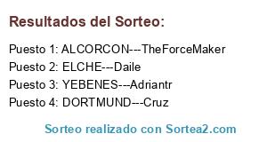Lista de participantes: ALCORCON---TheForceMaker, DORTMUND---Cruz, ELCHE---Daile, GIRONA---Trompexobox, GREMIO---Nexus, HERCULES---Nurhio, LEVANTE---Mikelo, YEBENES---Adriantr.