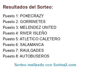 Lista de participantes: AUTOBUSEROS, SALAMANCA, MELENDEZ UNITED, POKECRAZY, RIVER ISLEÑO, GORRINETES, ATLETICO CALETERO, RAULGADES.