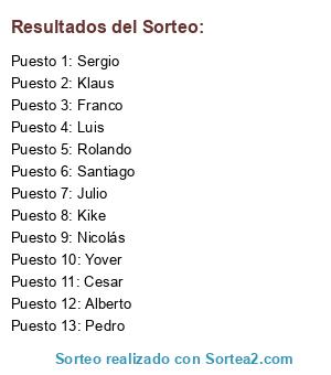 Lista de participantes: Alberto, Cesar, Franco, Julio, Kike, Klaus, Luis, Nicolás, Pedro, Rolando, Santiago, Sergio, Yover.